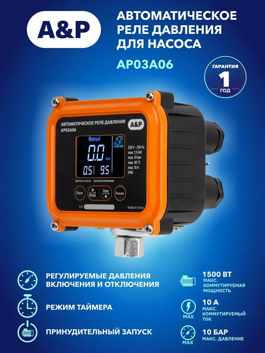 .Автоматическое реле давления для насосной станции 1/4" (внутренняя резьба) A&P (AP03A06) предназначено для эффективного управления давлением воды в системах бытового водоснабжения. Устройство способно поддерживать максимальное давление до 10 бар, что делает его идеальным выбором для обеспечения стабильной работы скважинного насоса для воды, водяной насосной станции, фекального насоса и др. Электронное реле насоса выполняет следующие функции: включает и выключает насос при достижении соответствующих порогов давления, настраиваемых индивидуально; обеспечивает защиту насоса от сухого хода; обеспечивает автоматический запуск насоса в заданные промежутки времени. Устройство имеет рабочий диапазон давлений 0,5+9,5 Бар и предназначено для автоматизации работы электронасосов мощностью до 1,5 кВт. Диапазон рабочей температуры: от + 1 °С до +60 °С. Давление включения и выключения регулируются. Можно задать интервал включения и давление отключения для набора водонапорной башни. Предусмотрен режим таймера с диапазоном установки 0,1 - 24 часа. Принудительный запуск производится на 10 секунд, если насос не работал последние 24 часа. Напряжение питания 230 В подходит для большинства бытовых и коммерческих условий. Благодаря степени пылевлагозащиты IP65, устройство защищено от пыли и влаги, что обеспечивает его долговечность и надежность в эксплуатации.